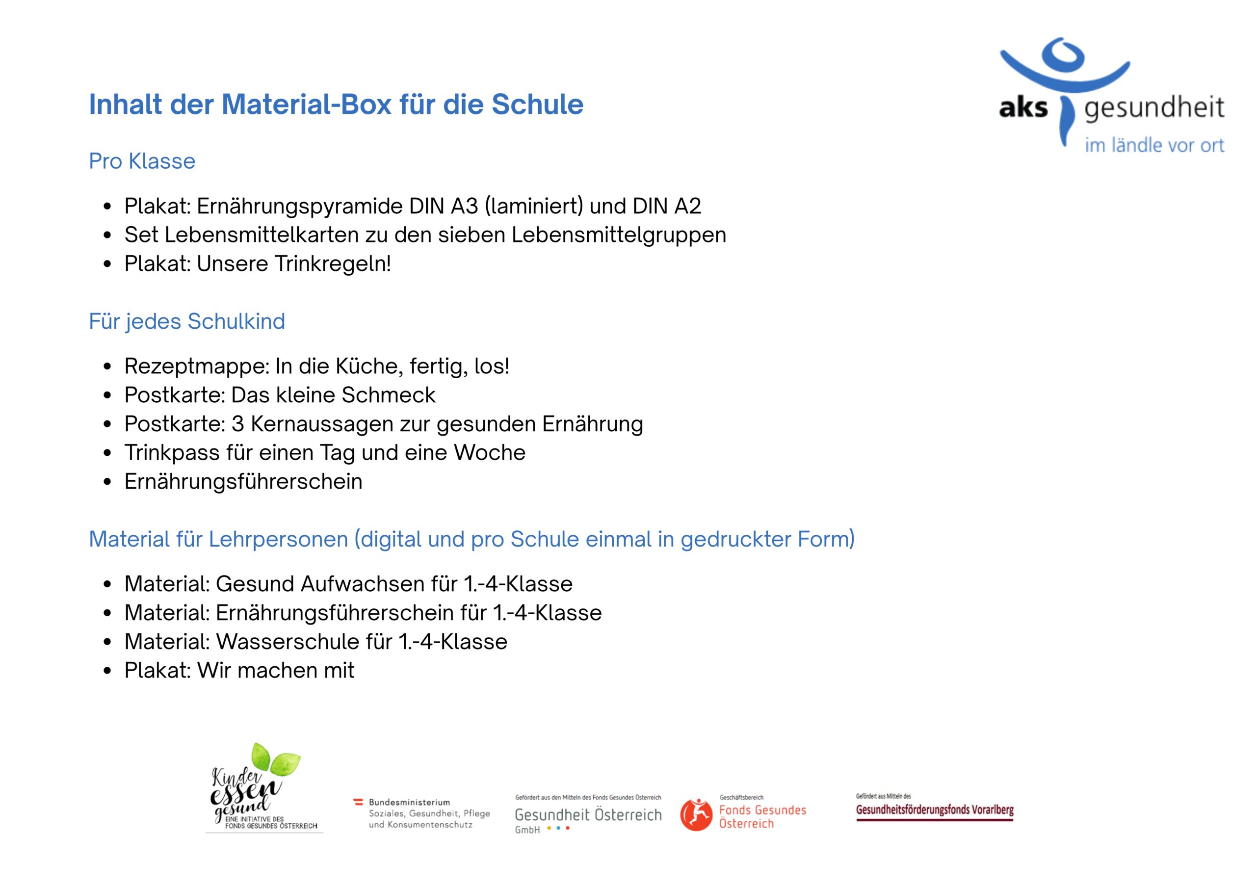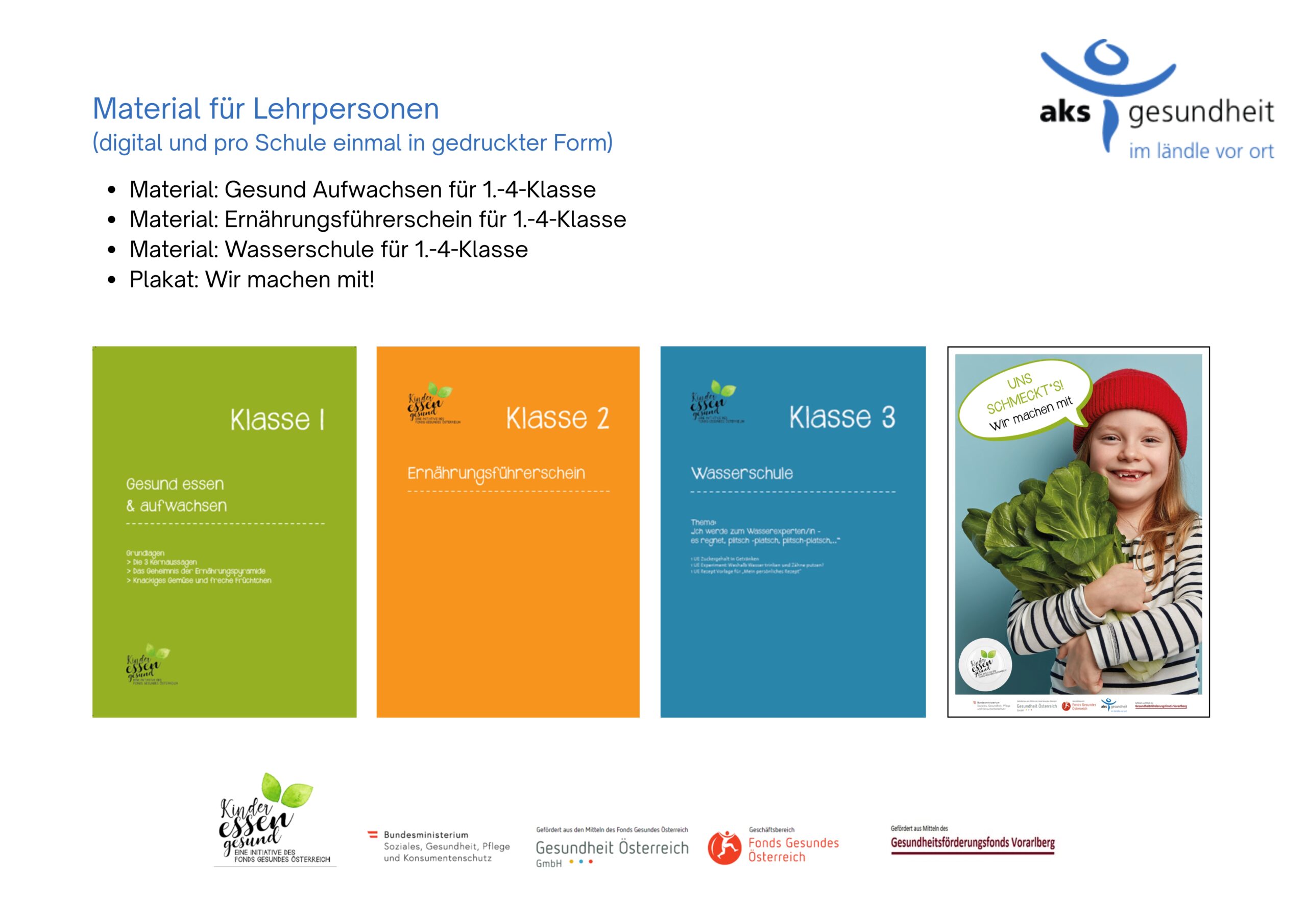 Um Ihre Kinder auf ihrem Weg zur Ernährungskompetenz zu begleiten, gibt es von der aks gesundheit GmbH für Volksschulen ein vielseitiges, umfangreiches Paket an Unterrichtsmaterialien.